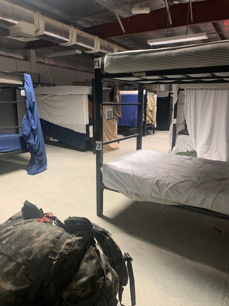A long row of identical buildings stood before me, separated by a cement walkway. Each building was numbered and served different purposes. Most of them were open bay barracks for transient personnel. Behind the flat-roofed buildings were latrine trailers. Further behind the trailers was the rest of the base, expanding for miles. I walked to the second building on my right, where dozens of stations were set up behind long counters. As I entered, I found the room check-in counter and was promptly handed a bundle of linen and bay number after presenting my military ID.