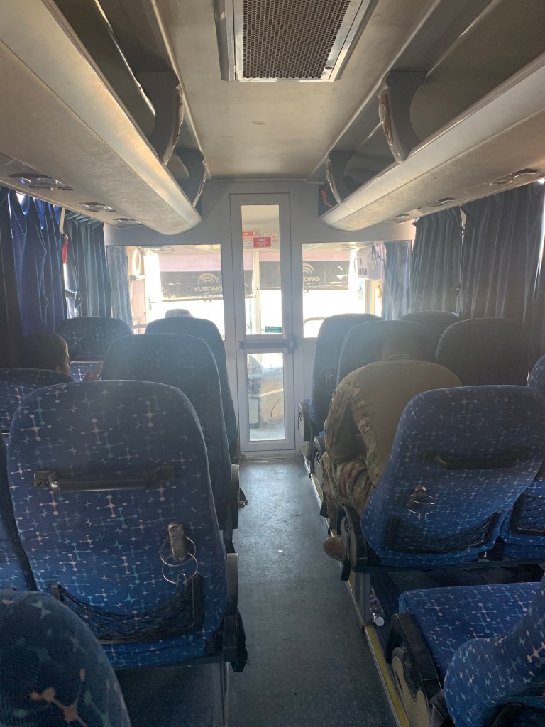 I was approached by a young specialist with shadowed facial hair exposed beyond the edges of his mask. Perhaps he had a shaving profile. He asked if I was one of the passengers on the bus. They were already getting ready to leave. “I sure am,” I told him. Two men entered the lobby with their bags, a lieutenant and a colonel. They were loud, boisterous, and looked eager to get somewhere. It turns out they weren’t on my bus. The two other mysterious passengers never showed. I hoisted my bags and followed the bearded soldier outside to a tall, rumbling bus with curtains over the windows.