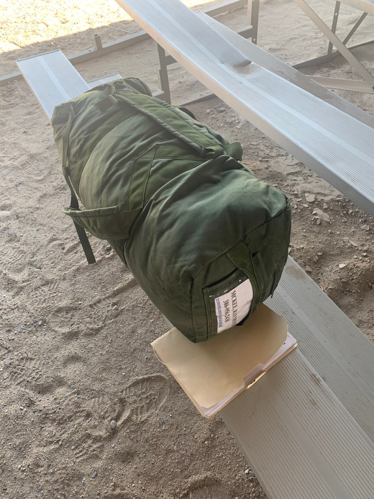 Hurrying outside, I walked a block down the road and found what looked like an entire company of soldiers gathered around. There were over a hundred of them, having just gotten off of one of the many idling buses parked nearby. Two forklifts approached with large aircraft pallets strapped with bags. They staged each pallet onto wood beams, allowing the pallet to be lifted again once it was set down. I saw green, black, and camouflaged bags of various patterns. Each green bag looked liked mine, similar to seeing your mother’s station wagon in every car while waiting to be picked up from school. I made my way through the crowd and began rummaging.