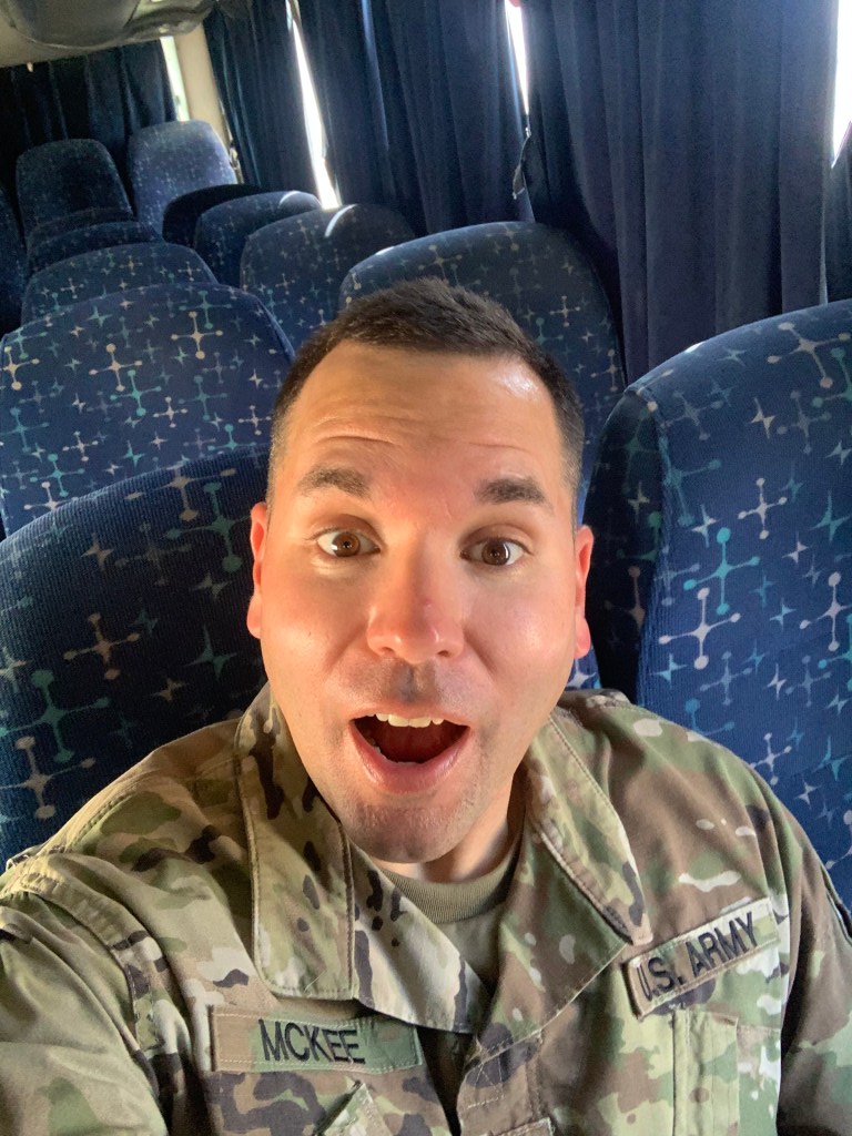He stood with his arms crossed, wearing a boonie hat and sunglasses. I thought that he might tell me to take a hike, but he was actually very helpful. He called out to the group and told them to look for a duffel with the name “McKee” on it. The line slowed as they put forth the effort. A short, stocky sergeant with a shaved head and a mustache then approached, having heard my dilemma. “One of the buses had a special delivery bag on it,” he told me. I rushed to the five buses parked across the street, galvanized by the revelation.