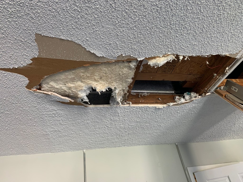 Of course, that’s not how it really happened. The real story is far less interesting. I was having A/C work done, replacing old ducts with modernized, flexible ones. It’s made quite the difference so far, and I couldn’t be happier. Special thanks to my good friends Jill & Brenden for making it happen. Anyway, everything had gone well until the end of the day, when my blunder occurred. I blame the tools I was carrying and the government, naturally. I also learned a valuable lesson in where not to step in an already cramped and stifling environment.