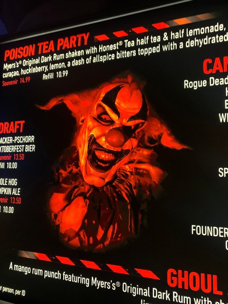 The performers/scare actors wore COVID masks, and the houses had these hanging Plexiglass coverings everywhere. It takes you out of the moment but remains necessary, I assume, for these attractions to operate during this time. I also noticed the limited drink options throughout the park, most likely to prevent drunken morons from attacking costumed employees, among other reasons.