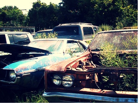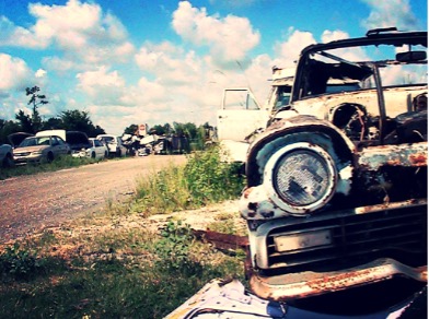In the middle of the woods sat an abandoned ’70s car, mostly a rusty frame with the glass smashed out, covered in pine needles and pine cones. The bench seats in the front and back were torn, with springs protruding from the vinyl. I can’t remember if it had tires or even an engine.